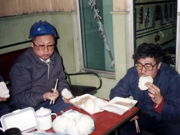 秦裕琨院士(左)深夜在黃島電廠現(xiàn)場參加新燃燒器調(diào)試后用餐