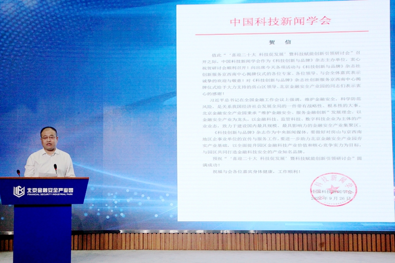 9月26日,“喜迎二十大 科技促發(fā)展”暨科技賦能創(chuàng)新引領(lǐng)研討會在北京舉行,《科技創(chuàng)新與品牌》雜志社創(chuàng)新服務京西南中心落地房山北京金融安全產(chǎn)業(yè)園,中國工程院院士、《科技創(chuàng)新與品牌》雜志社編委會主任侯立安及房山區(qū)副區(qū)長劉金輝為中心揭牌,中國科技新聞學會致信表示祝賀。