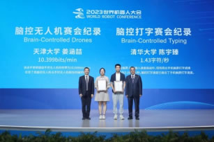 本屆大會(huì)產(chǎn)生了兩項(xiàng)紀(jì)錄,分別是2023世界機(jī)器人大會(huì)腦控打字、腦控?zé)o人機(jī)賽會(huì)記錄,北京市經(jīng)濟(jì)和信息化局黨組書記、局長(zhǎng)姜廣智,北京經(jīng)濟(jì)技術(shù)開(kāi)發(fā)區(qū)管委會(huì)主任孔磊為兩項(xiàng)紀(jì)錄創(chuàng)造者頒發(fā)證書。