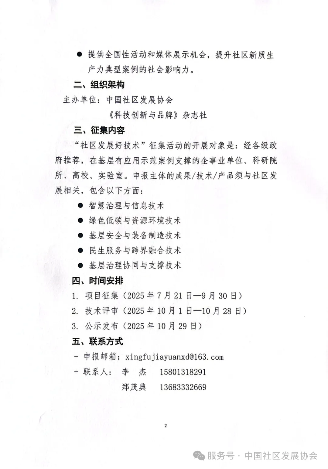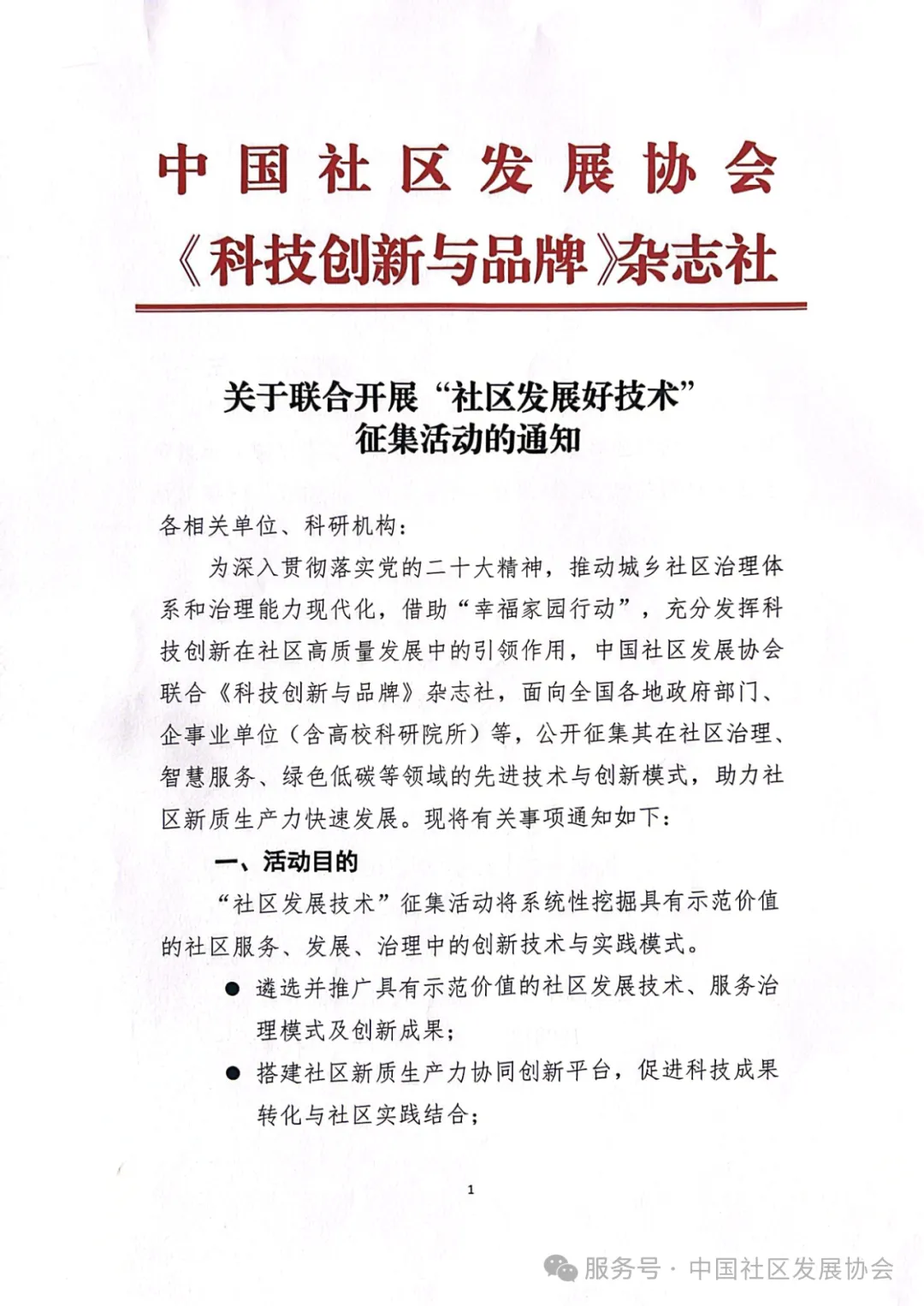 為深入貫徹落實(shí)黨的二十大精神,推動(dòng)城鄉(xiāng)社區(qū)治理體系和治理能力現(xiàn)代化,借助“幸福家園行動(dòng)”,充分發(fā)揮科技創(chuàng)新在社區(qū)高質(zhì)量發(fā)展中的引領(lǐng)作用,中國社區(qū)發(fā)展協(xié)會(huì)聯(lián)合《科技創(chuàng)新與品牌》雜志社,面向全國各地政府部門、企事業(yè)單位(含高??蒲性核?等,公開征集其在社區(qū)治理智慧服務(wù)、綠色低碳等領(lǐng)域的先進(jìn)技術(shù)與創(chuàng)新模式,助力社區(qū)新質(zhì)生產(chǎn)力快速發(fā)展?,F(xiàn)將有關(guān)事項(xiàng)通知如下: