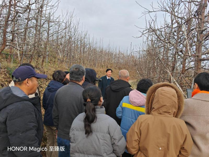 座談會后,專家服務團一行前往玉泉山種植合作社梨、蘋果種植基地開展現(xiàn)場技術(shù)指導。在田間地頭,張強研究員針對蘋果種植中的精細化管理技術(shù),從土肥水管理、花期調(diào)控到果實套袋、采后商品化處理等環(huán)節(jié)進行細致講解;張鶴研究員為農(nóng)戶提供采收時機選擇、預處理方法等實操建議;張玉星教授則圍繞梨樹種形修剪、病蟲害綠色防控等優(yōu)質(zhì)栽培技術(shù)進行現(xiàn)場示范,并推薦了適宜當?shù)貧夂蛲寥罈l件的優(yōu)良品種。專家們手把手教學、面對面答疑,將先進技術(shù)和前沿理念送到田間地頭,讓農(nóng)戶們受益匪淺。