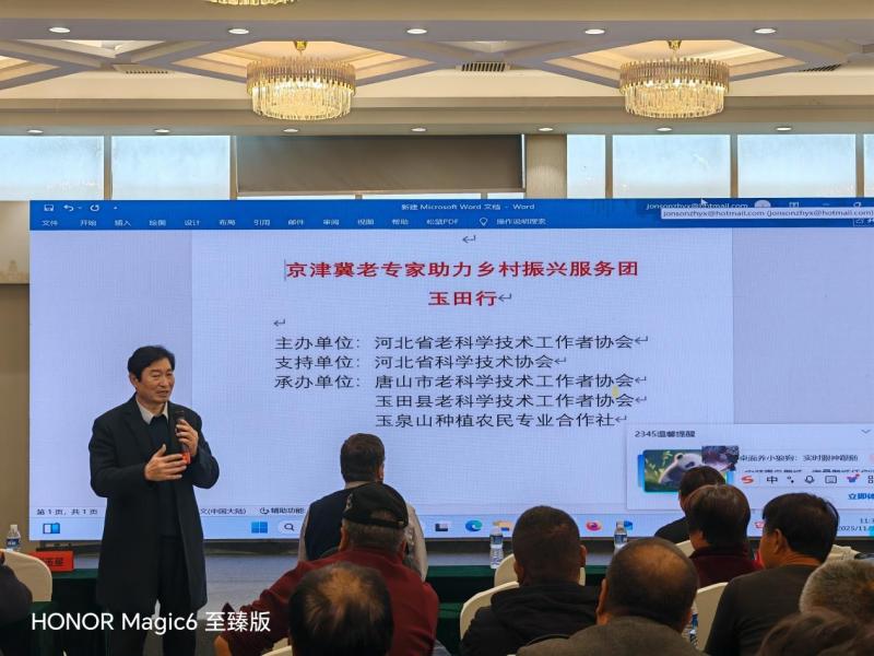 為響應黨的二十屆四中全會關(guān)于發(fā)展品牌農(nóng)業(yè)、推動鄉(xiāng)村全面振興的號召,2025 年 11 月 24 日,“京津冀老專家助力鄉(xiāng)村振興服務團玉田行” 活動在玉田縣成功舉辦。本次活動由河北省老科學技術(shù)工作者協(xié)會主辦,河北省科學技術(shù)協(xié)會支持,唐山市老科學技術(shù)工作者協(xié)會、玉田縣老科學技術(shù)工作者協(xié)會及唐山玉田縣玉泉山種植農(nóng)民專業(yè)合作社聯(lián)合承辦,三位京津冀地區(qū)果樹與農(nóng)產(chǎn)品保鮮領(lǐng)域的權(quán)威專家齊聚一堂,為當?shù)剞r(nóng)業(yè)產(chǎn)業(yè)發(fā)展注入強勁科技動能。