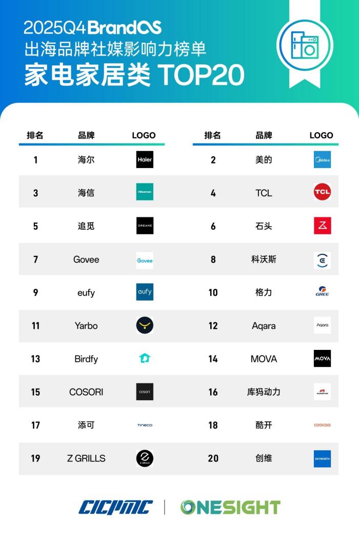 為貫徹落實(shí)黨中央、國務(wù)院關(guān)于推動(dòng)和服務(wù)中國企業(yè)出海的戰(zhàn)略決策,2026年1月20日,經(jīng)中國國際跨國公司促進(jìn)會(huì)監(jiān)制及其戰(zhàn)略合作伙伴中國品牌出海領(lǐng)導(dǎo)者OneSight聯(lián)合發(fā)布的2025Q4《BrandOS出海品牌社媒影響力榜單》正式揭曉。該榜單以“數(shù)據(jù)公開透明性+行業(yè)適配性”為核心原則,提供覆蓋消費(fèi)電子、汽車、家電家居、新能源、智能制造等8大核心領(lǐng)域的榜單,直觀反映品牌在全球化進(jìn)程中的階段性成果。