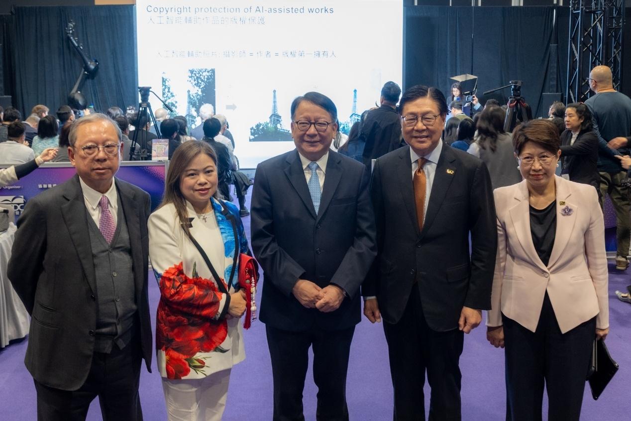 香港政府領(lǐng)導(dǎo)來(lái)到“AI 學(xué)院”參觀 從左到右:香港貿(mào)發(fā)局影視娛樂(lè)業(yè)咨詢委員會(huì)主席林建岳、香港特別行政區(qū)文化體育及旅游局局長(zhǎng)羅淑佩、香港特別行政區(qū)政務(wù)司司長(zhǎng)陳國(guó)基、香港貿(mào)發(fā)局主席馬時(shí)亨、香港貿(mào)發(fā)局總裁張淑芬