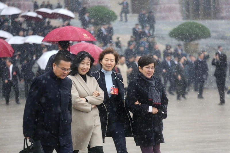 人民大會(huì)堂前,潔白的雪花悠悠飄落,整個(gè)建筑在浪漫的雪景中更顯莊嚴(yán)肅穆。代表們迎著飄雪,漫步在廣場(chǎng)上,一邊熱絡(luò)問(wèn)好,一邊積極地交流著想法。潔白的雪、莊嚴(yán)的殿堂與代表們活躍友好的身影,構(gòu)成了一幅和諧的畫(huà)面。