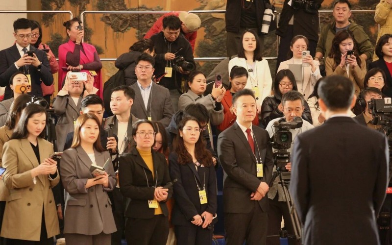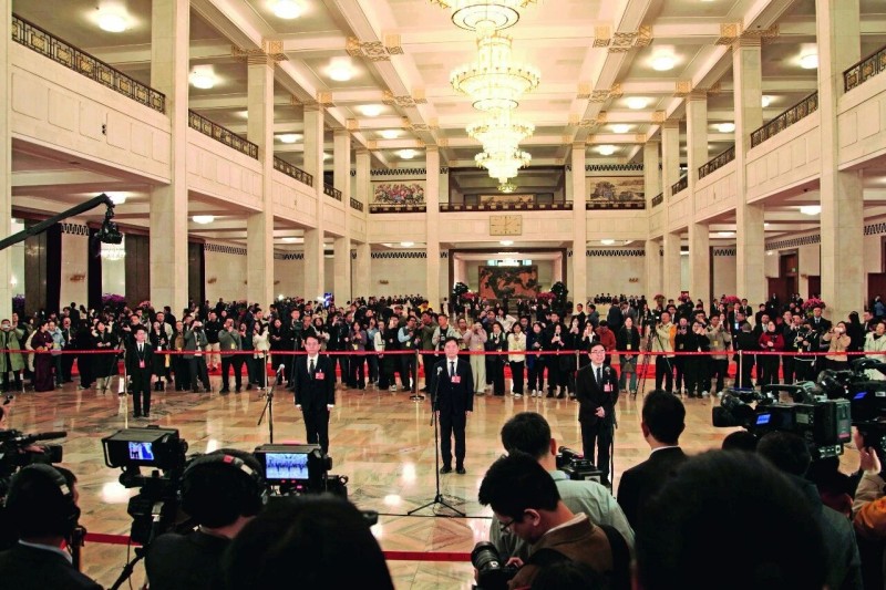 全國政協(xié)十四屆四次會議第一場“委員通道”集體采訪。攝影/本刊記者 鄭茂典